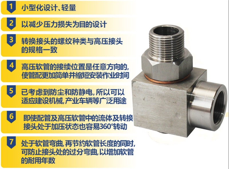 高压软管的接续位置是任意方向的,使管配更加简单并缩短安装作业时间已考虑到防尘和防静电,所以可以适应建设机械,产业车辆等广泛用途